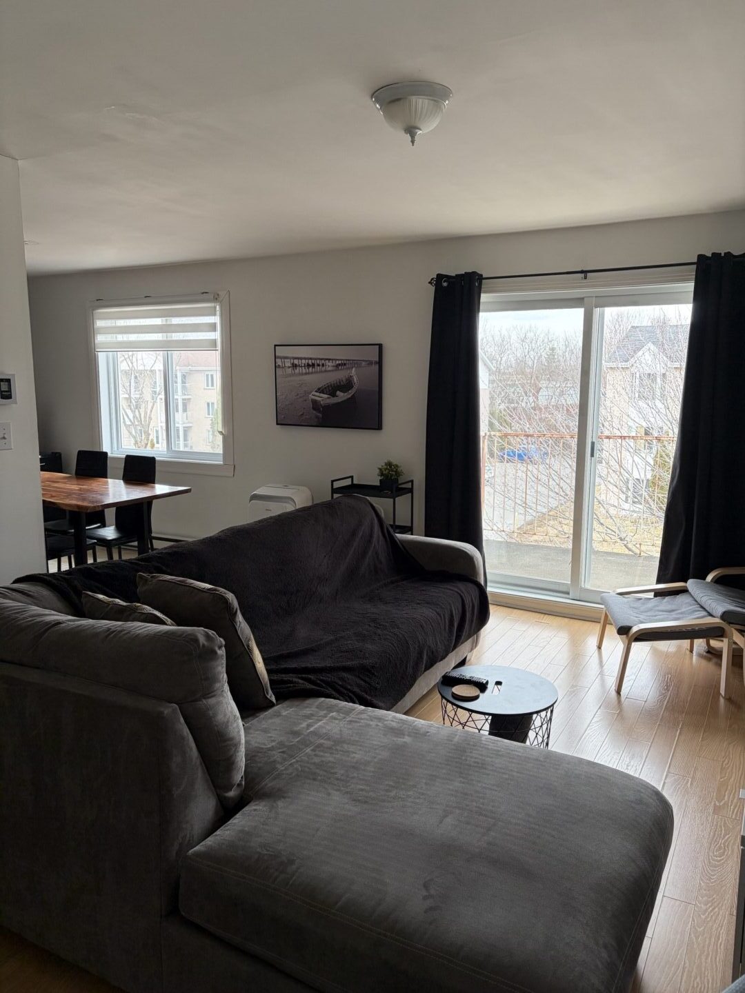 Un grand salon avec balcon et porte patio