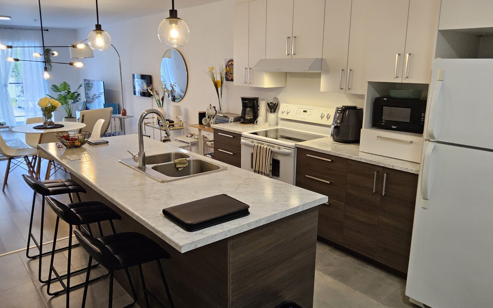 Condo moderne, lumineux et spacieux dans un secteur paisible et recherché, à proximité du Centre Les Rivières, du KiNipi Spa et du Club de golf Ki-8-Eb. Idéal pour professionnels, retraités ou couples.